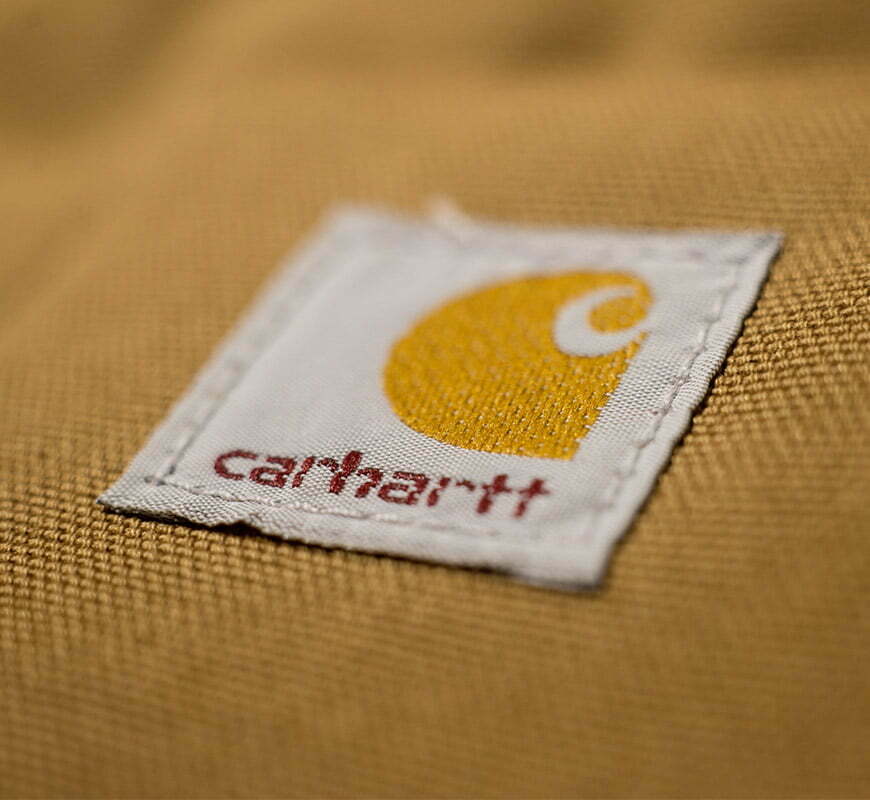 Chez Carhartt, on retrouve trois niveaux de finition du tissu « Cotton Duck » : “Firm duck” coton brut non lavé, “Washed duck” coton brut lavé et “Sandstone duck” à l’aspect micro sablé. Carhartt c’est sa couleur marron iconique. Le “Carhartt Brown”, un ocre-brun vieilli est la signature de la marque. C’est aussi l’histoire de son étiquette vieux jaune un poil sali qui fait penser aux engins de chantier.